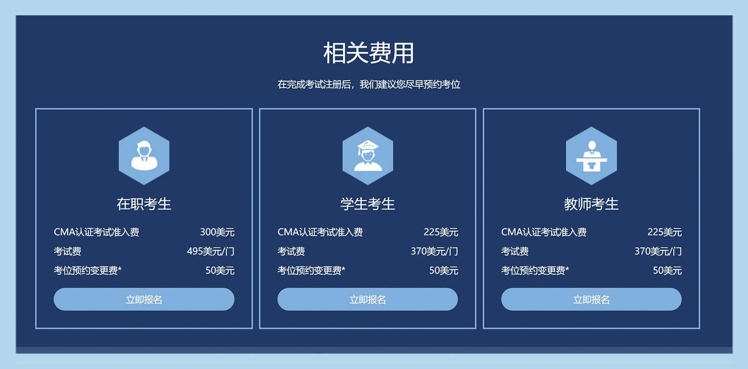 注意:您必须支付CMA考生年费并在支付考试准入费用后才能注册考试。